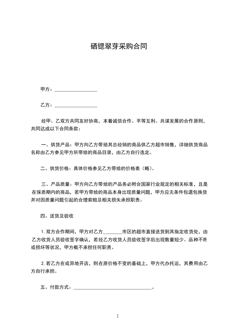 3、产品的保质期为_________________________。在保质期内,产品出现非人为损害的质量问题,甲方无条件退货或换货。