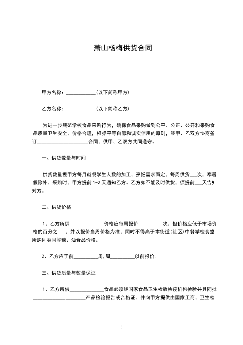 供货数量视甲方每月就餐学生人数的加工、烹饪需求而定,每周供货___次,寒暑假除外。采购时,甲方提前1-2天通知乙方。乙方如不能及时供货,须提前___天告知对方。