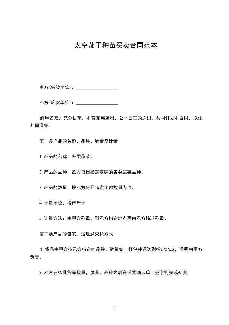 1、乙方为甲方提供蔬菜类产品约______种左右,供货价格乙方承诺在成本价格上加价______元/公斤—______元/公斤,必须保证为市场最低供货价格。