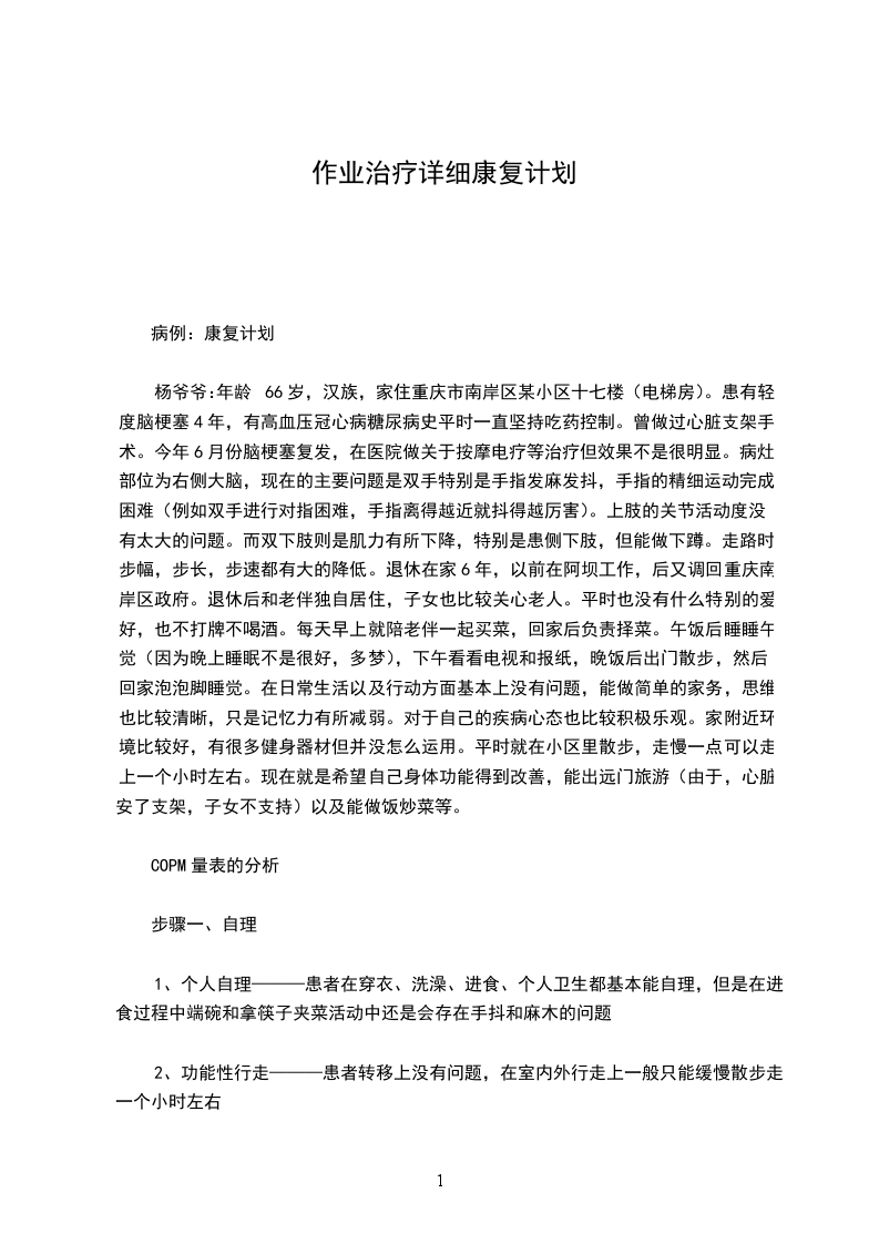杨爷爷:年龄66岁,汉族,家住重庆市南岸区某小区十七楼(电梯房)。患有轻度脑梗塞4年,有高血压冠心病糖尿病史平时一直坚持吃药控制。曾做过心脏支架手术。今年6月份脑梗塞复发,在医院做关于按摩电疗等治疗但效果不是很明显。病灶部位为右侧大脑,现在的主要问题是双手特别是手指发麻发抖,手指的精细运动完成困难(例如双手进行对指困难,手指离得越近就抖得越厉害)。上肢的关节活动度没有太大的问题。而双下肢则是肌力有所下降,特别是患侧下肢,但能做下蹲。走路时,步幅,步长,步速都有大的降低。退休在家6年,以前在阿坝工作,后又调回重庆南岸区政府。退休后和老伴独自居住,子女也比较关心老人。平时也没有什么特别的爱好,也不打牌不喝酒。每天早上就陪老伴一起买菜,回家后负责择菜。午饭后睡睡午觉(因为晚上睡眠不是很好,多梦),下午看看电视和报纸,晚饭后出门散步,然后回家泡泡脚睡觉。在日常生活以及行动方面基本上没有问题,能做简单的家务,思维也比较清晰,只是记忆力有所减弱。对于自己的疾病心态也比较积极乐观。家附近环境比较好,有很多健身器材但并没怎么运用。平时就在小区里散步,走慢一点可以走上一个小时左右。现在就是希望自己身体功能得到改善,能出远门旅游(由于,心脏安了支架,子女不支持)以及能做饭炒菜等。