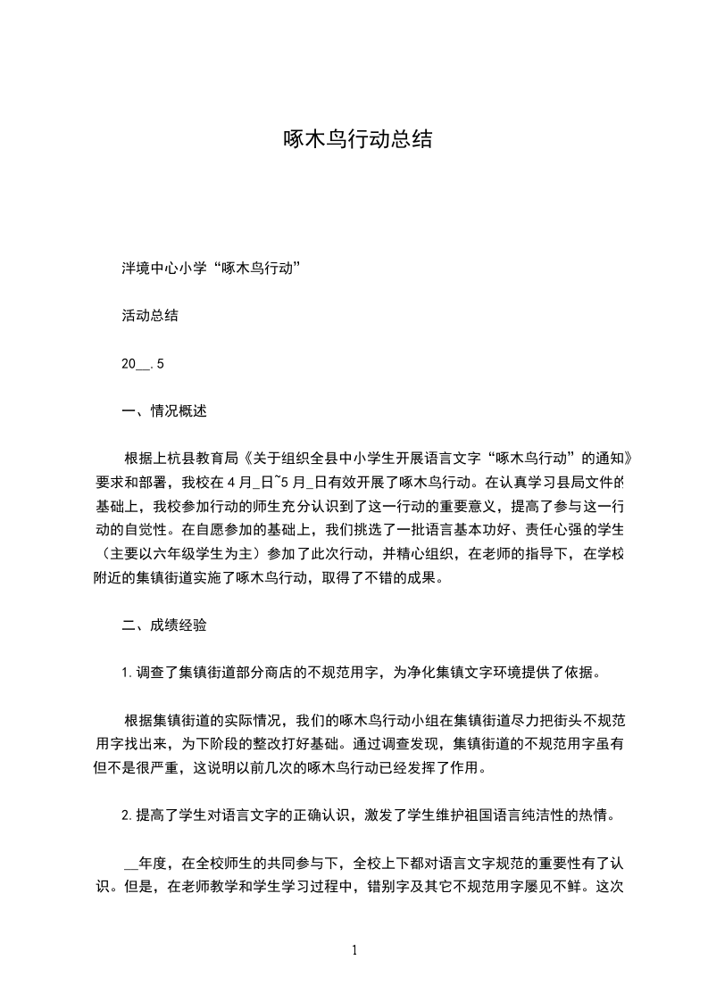 根据上杭县教育局《关于组织全县中小学生开展语言文字“啄木鸟行动”的通知》要求和部署,我校在4月_日~5月_日有效开展了啄木鸟行动。在认真学习县局文件的基础上,我校参加行动的师生充分认识到了这一行动的重要意义,提高了参与这一行动的自觉性。在自愿参加的基础上,我们挑选了一批语言基本功好、责任心强的学生(主要以六年级学生为主)参加了此次行动,并精心组织,在老师的指导下,在学校附近的集镇街道实施了啄木鸟行动,取得了不错的成果。