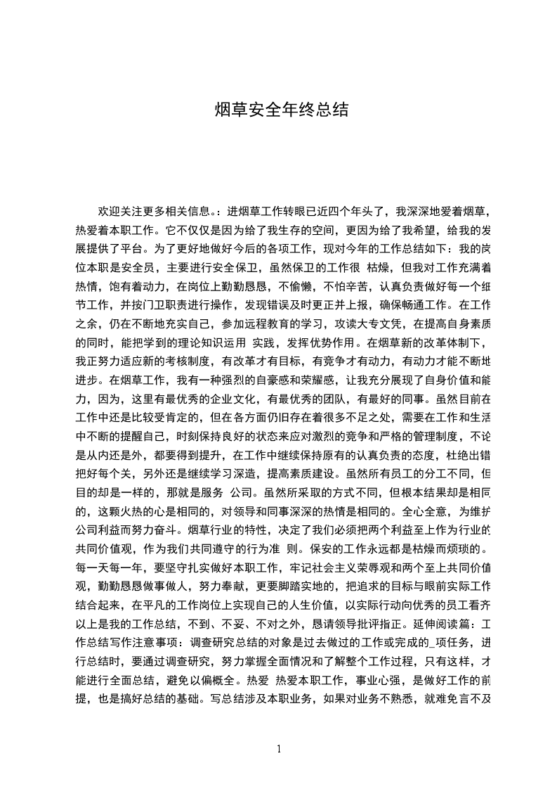 欢迎关注更多相关信息。:进烟草工作转眼已近四个年头了,我深深地爱着烟草,热爱着本职工作。它不仅仅是因为给了我生存的空间,更因为给了我希望,给我的发展提供了平台。为了更好地做好今后的各项工作,现对今年的工作总结如下:我的岗位本职是安全员,主要进行安全保卫,虽然保卫的工作很 枯燥,但我对工作充满着热情,饱有着动力,在岗位上勤勤恳恳,不偷懒,不怕辛苦,认真负责做好每一个细节工作,并按门卫职责进行操作,发现错误及时更正并上报,确保畅通工作。在工作之余,仍在不断地充实自己,参加远程教育的学习,攻读大专文凭,在提高自身素质的同时,能把学到的理论知识运用 实践,发挥优势作用。在烟草新的改革体制下,我正努力适应新的考核制度,有改革才有目标,有竞争才有动力,有动力才能不断地进步。在烟草工作,我有一种强烈的自豪感和荣耀感,让我充分展现了自身价值和能力,因为,这里有最优秀的企业文化,有最优秀的团队,有最好的同事。虽然目前在工作中还是比较受肯定的,但在各方面仍旧存在着很多不足之处,需要在工作和生活中不断的提醒自己,时刻保持良好的状态来应对激烈的竞争和严格的管理制度,不论是从内还是外,都要得到提升,在工作中继续保持原有的认真负责的态度,杜绝出错,把好每个关,另外还是继续学习深造,提高素质建设。虽然所有员工的分工不同,但目的却是一样的,那就是服务 公司。虽然所采取的方式不同,但根本结果却是相同的,这颗火热的心是相同的,对领导和同事深深的热情是相同的。全心全意,为维护公司利益而努力奋斗。烟草行业的特性,决定了我们必须把两个利益至上作为行业的共同价值观,作为我们共同遵守的行为准 则。保安的工作永远都是枯燥而烦琐的。每一天每一年,要坚守扎实做好本职工作,牢记社会主义荣辱观和两个至上共同价值观,勤勤恳恳做事做人,努力奉献,更要脚踏实地的,把追求的目标与眼前实际工作结合起来,在平凡的工作岗位上实现自己的人生价值,以实际行动向优秀的员工看齐。以上是我的工作总结,不到、不妥、不对之外,恳请领导批评指正。延伸阅读篇:工作总结写作注意事项:调查研究总结的对象是过去做过的工作或完成的_项任务,进行总结时,要通过调查研究,努力掌握全面情况和了解整个工作过程,只有这样,才能进行全面总结,避免以偏概全。热爱 热爱本职工作,事业心强,是做好工作的前提,也是搞好总结的基础。写总结涉及本职业务,如果对业务不熟悉,就难免言不及义。实事求是总结是对以往工作的评价,必须坚持实事求是的原则。就像陈云同志所说的那样,是成绩就写成绩,是错误就写错误;是大错误就写大错误,是小错误就写小错误。夸大成绩,报喜不报忧,违反作总结的目的的不良行为,我们应当摒弃。