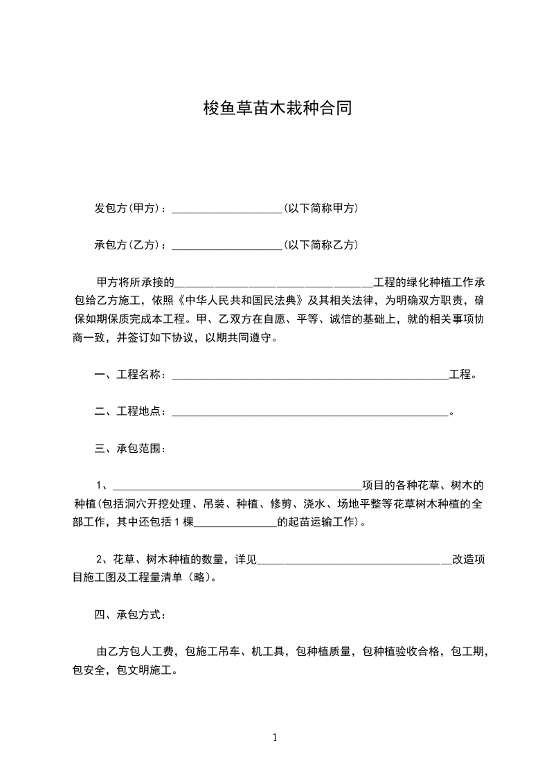甲方将所承接的___________________________________工程的绿化种植工作承包给乙方施工,依照《中华人民共和国民法典》及其相关法律,为明确双方职责,确保如期保质完成本工程。甲、乙双方在自愿、平等、诚信的基础上,就的相关事项协商一致,并签订如下协议,以期共同遵守。