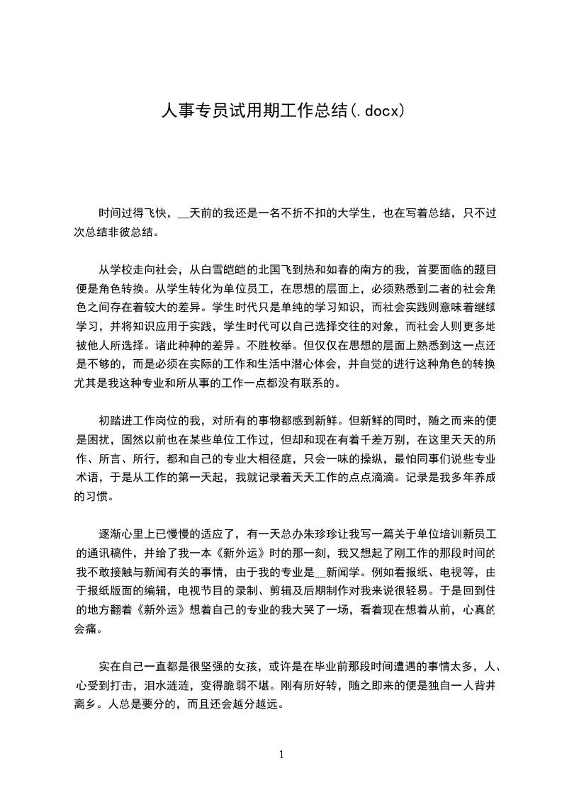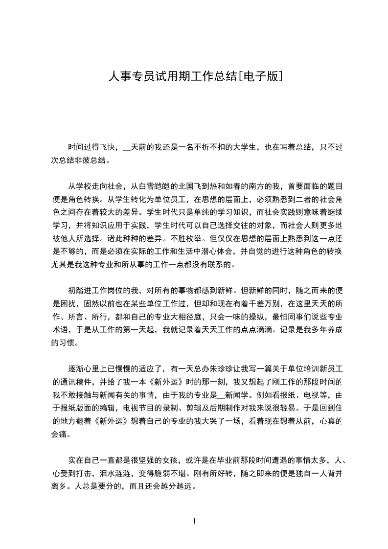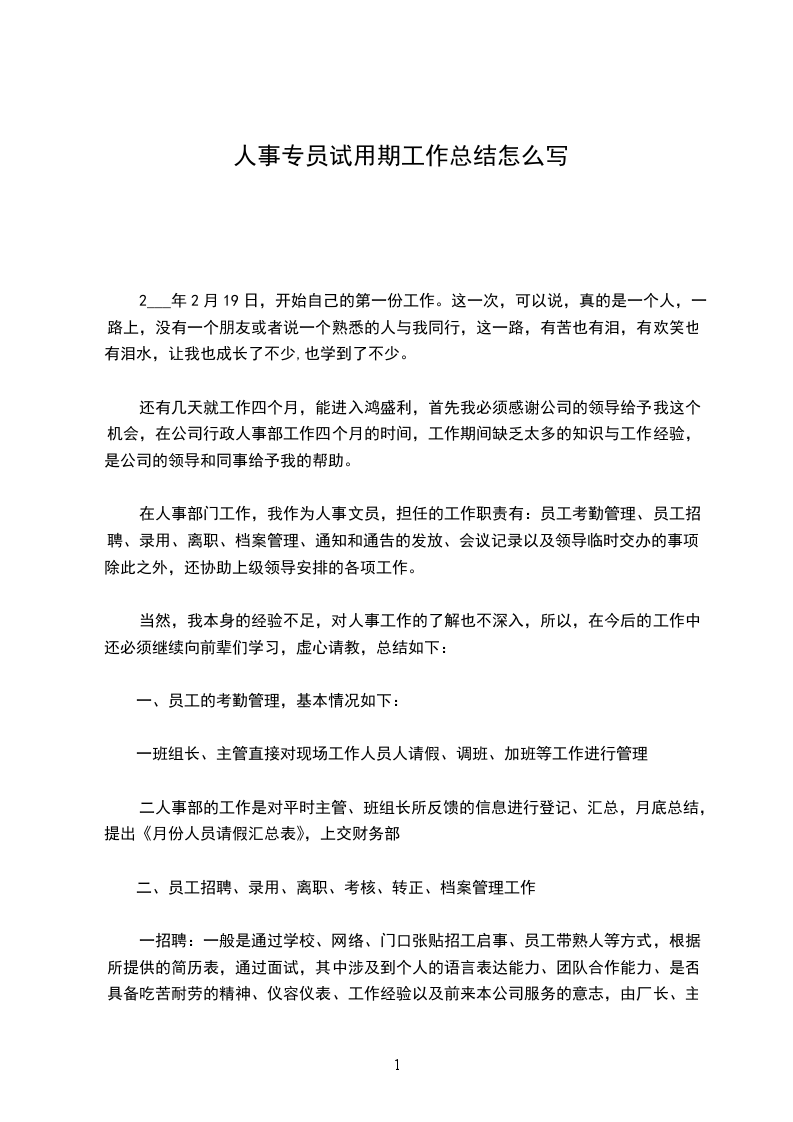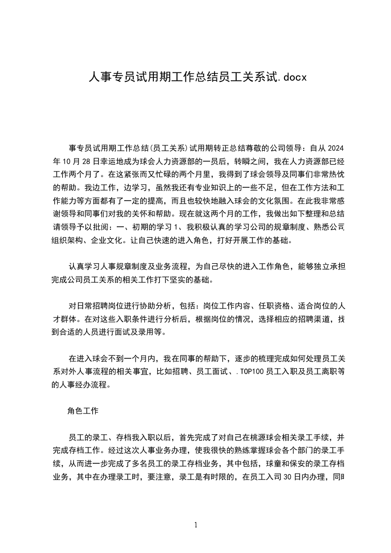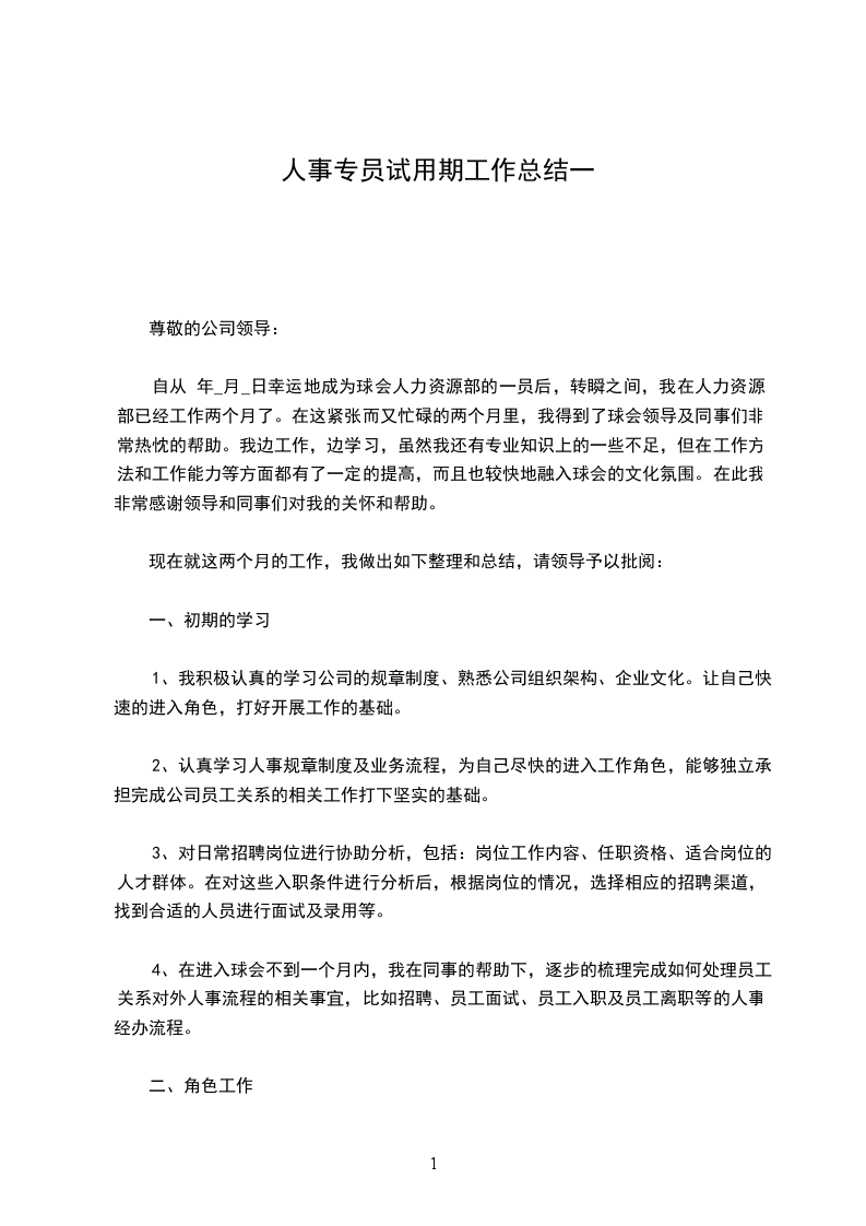 自从 年_月_日幸运地成为球会人力资源部的一员后,转瞬之间,我在人力资源部已经工作两个月了。在这紧张而又忙碌的两个月里,我得到了球会领导及同事们非常热忱的帮助。我边工作,边学习,虽然我还有专业知识上的一些不足,但在工作方法和工作能力等方面都有了一定的提高,而且也较快地融入球会的文化氛围。在此我非常感谢领导和同事们对我的关怀和帮助。