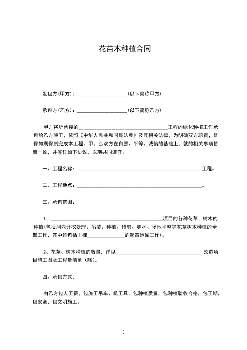 甲方将所承接的___________________________________工程的绿化种植工作承包给乙方施工,依照《中华人民共和国民法典》及其相关法律,为明确双方职责,确保如期保质完成本工程。甲、乙双方在自愿、平等、诚信的基础上,就的相关事项协商一致,并签订如下协议,以期共同遵守。