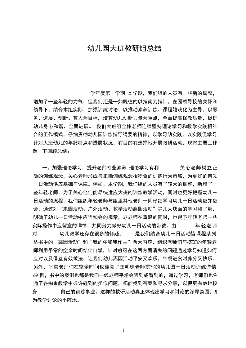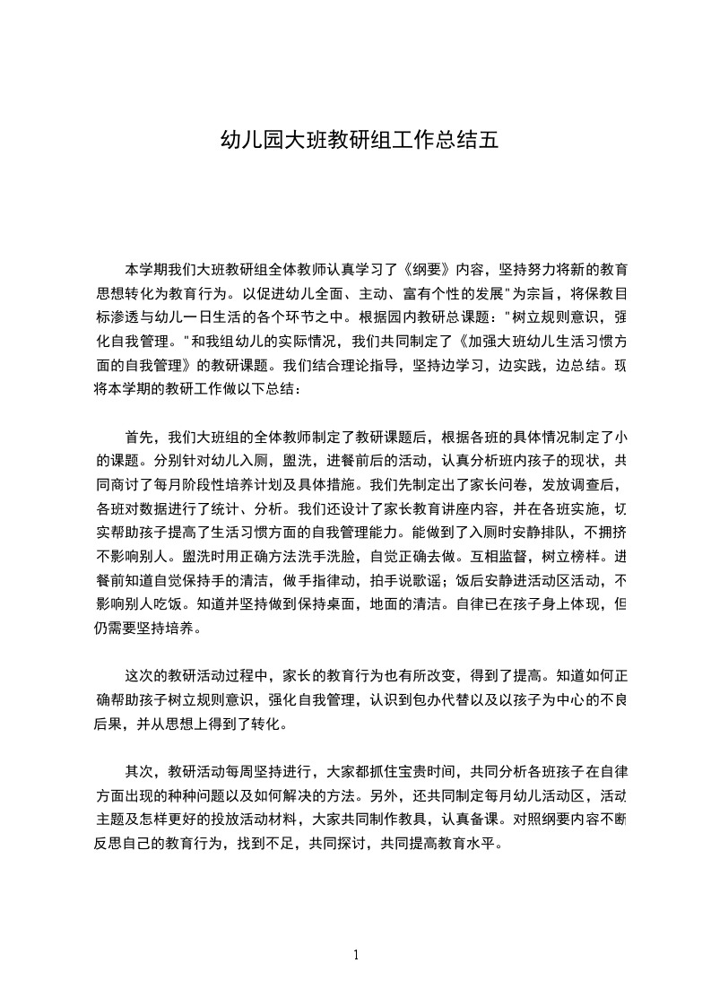 本学期我们大班教研组全体教师认真学习了《纲要》内容,坚持努力将新的教育思想转化为教育行为。以促进幼儿全面、主动、富有个性的发展"为宗旨,将保教目标渗透与幼儿一日生活的各个环节之中。根据园内教研总课题:"树立规则意识,强化自我管理。"和我组幼儿的实际情况,我们共同制定了《加强大班幼儿生活习惯方面的自我管理》的教研课题。我们结合理论指导,坚持边学习,边实践,边总结。现将本学期的教研工作做以下总结: