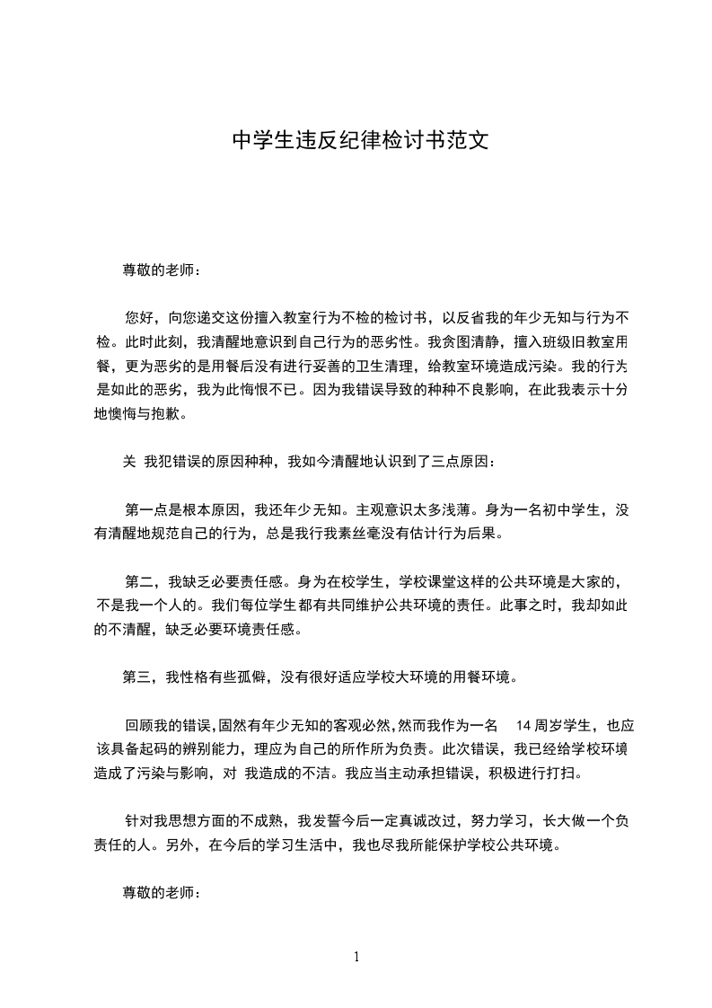 您好,向您递交这份擅入教室行为不检的检讨书,以反省我的年少无知与行为不检。此时此刻,我清醒地意识到自己行为的恶劣性。我贪图清静,擅入班级旧教室用餐,更为恶劣的是用餐后没有进行妥善的卫生清理,给教室环境造成污染。我的行为是如此的恶劣,我为此悔恨不已。因为我错误导致的种种不良影响,在此我表示十分地懊悔与抱歉。