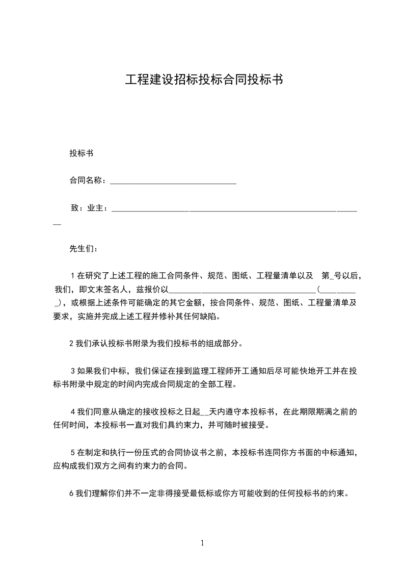 1、在研究了上述工程的施工合同条件、规范、图纸、工程量清单以及附件第_号以后,我们,即文末签名人,兹报价以____________________________________(__________),或根据上述条件可能确定的其它金额,按合同条件、规范、图纸、工程量清单及附件要求,实施并完成上述工程并修补其任何缺陷。