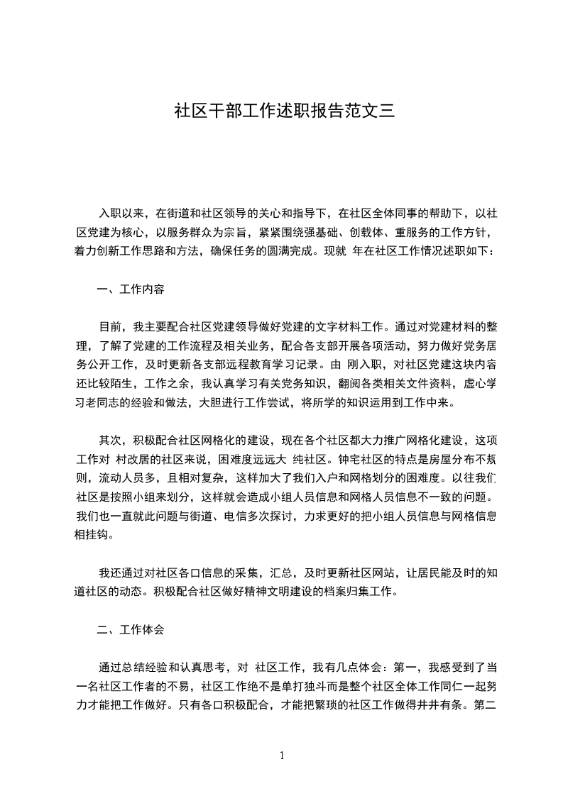 入职以来,在街道和社区领导的关心和指导下,在社区全体同事的帮助下,以社区党建为核心,以服务群众为宗旨,紧紧围绕强基础、创载体、重服务的工作方针,着力创新工作思路和方法,确保任务的圆满完成。现就 年在社区工作情况述职如下: