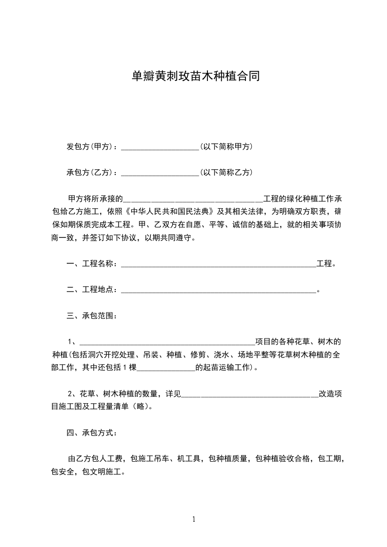 甲方将所承接的___________________________________工程的绿化种植工作承包给乙方施工,依照《中华人民共和国民法典》及其相关法律,为明确双方职责,确保如期保质完成本工程。甲、乙双方在自愿、平等、诚信的基础上,就的相关事项协商一致,并签订如下协议,以期共同遵守。