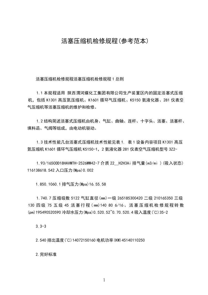 1.1本规程适用 陕西渭河煤化工集团有限公司生产装置区内的固定活塞式压缩机,包括K1301高压氮压缩机、K1601循环气压缩机、K5150氨液化器、281仪表空气压缩机等活塞压缩机的维护和检修。