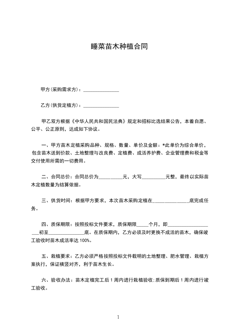 二、合同总价:合同总价为__________元,大写__________元整,最终以实际苗木定植数量为结算依据。