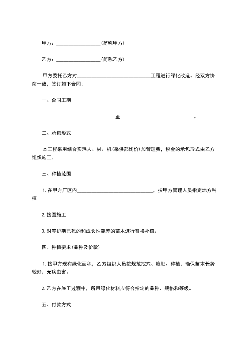 甲方委托乙方对__________工程进行绿化改造。经双方协商一致,签订如下合同: