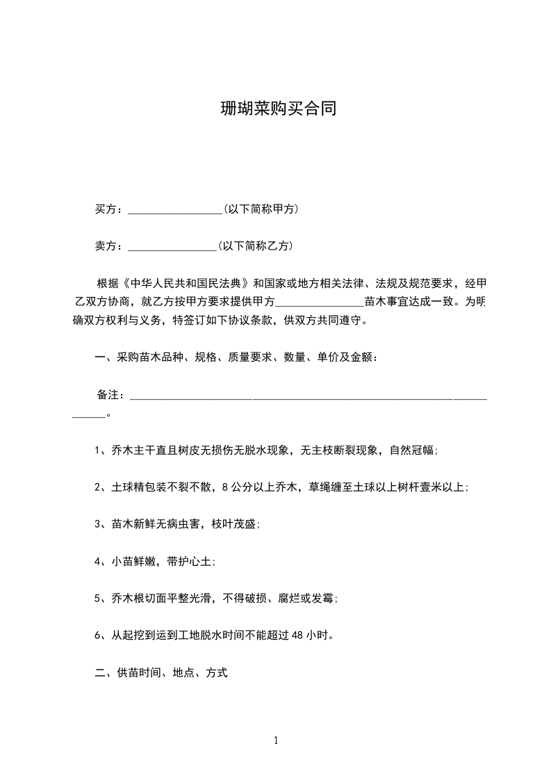 根据《中华人民共和国民法典》和国家或地方相关法律、法规及规范要求,经甲乙双方协商,就乙方按甲方要求提供甲方________________苗木事宜达成一致。为明确双方权利与义务,特签订如下协议条款,供双方共同遵守。