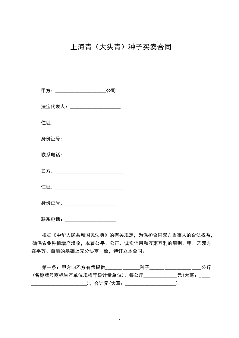 第一条:甲方向乙方有偿提供______________种子_____________________公斤(名称牌号商标生产单位规格等级计量单位),每公斤______________元(大写:____________________________),合计元(大写:_____________________)。