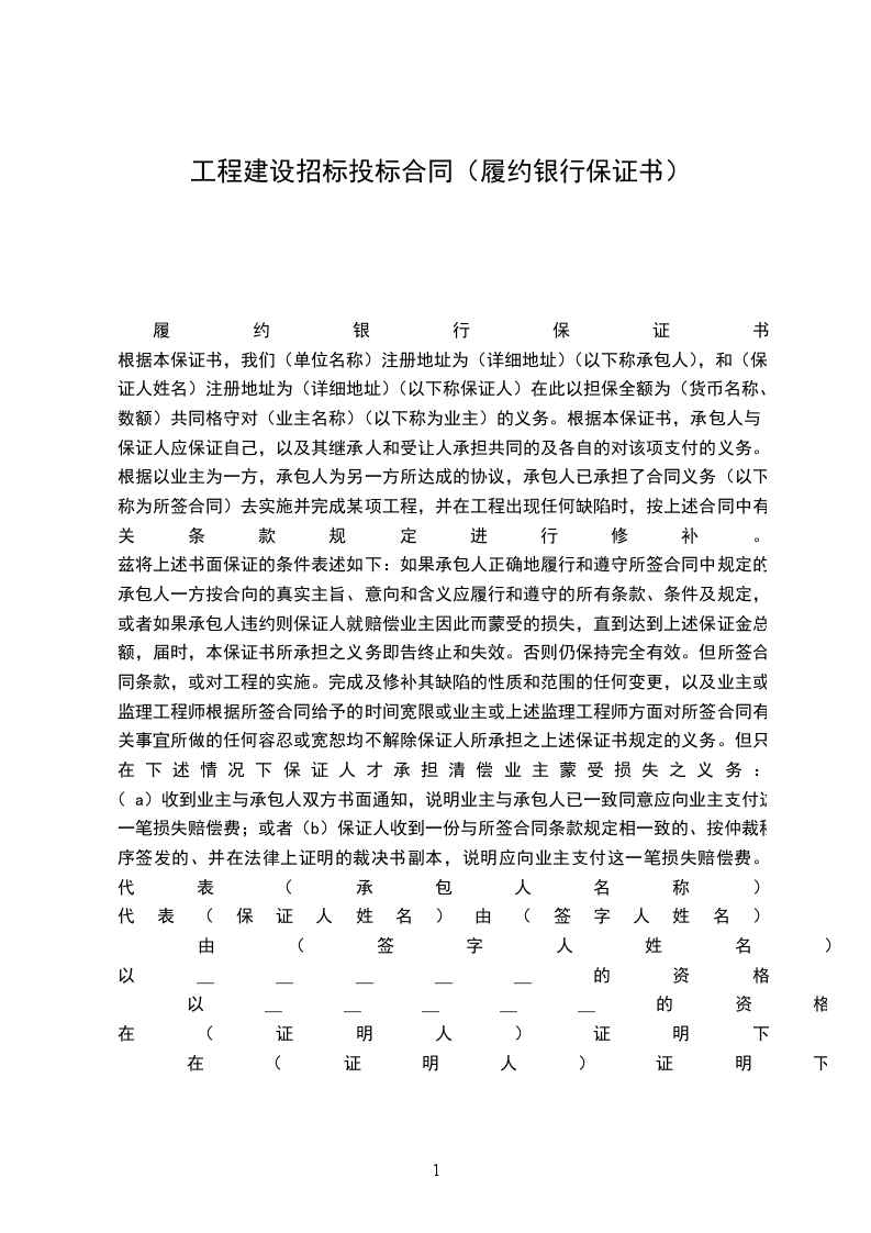 根据本保证书,我们(单位名称)注册地址为(详细地址)(以下称承包人),和(保证人姓名)注册地址为(详细地址)(以下称保证人)在此以担保全额为(货币名称、数额)共同格守对(业主名称)(以下称为业主)的义务。根据本保证书,承包人与保证人应保证自己,以及其继承人和受让人承担共同的及各自的对该项支付的义务。