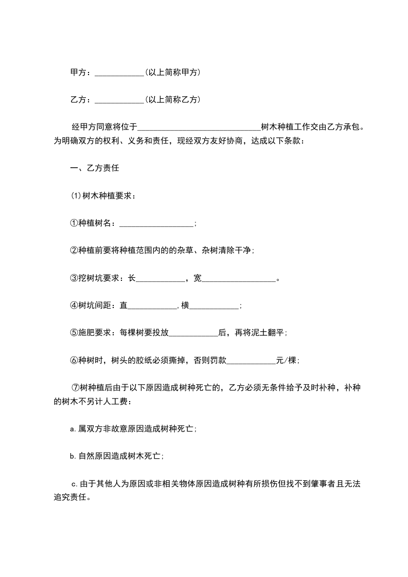 经甲方同意将位于______________________________树木种植工作交由乙方承包。为明确双方的权利、义务和责任,现经双方友好协商,达成以下条款: