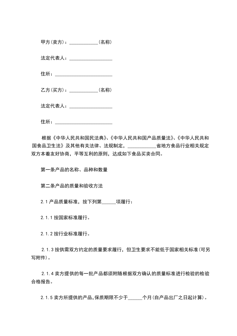 根据《中华人民共和国民法典》、《中华人民共和国产品质量法》、《中华人民共和国食品卫生法》及其他有关法律、法规制定,____________省地方食品行业相关规定,双方本着友好协商,平等互利的原则,达成如下食品买卖合同。