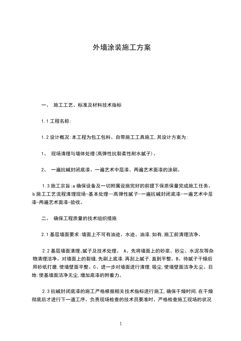 1.3施工宗旨:a确保设备及一切附属设施完好的前提下保质保量完成施工任务。b施工工艺流程清理现场-基本处理--高弹性腻子-一遍抗碱封闭底漆-一遍艺术中层漆-两遍艺术面漆-验收。