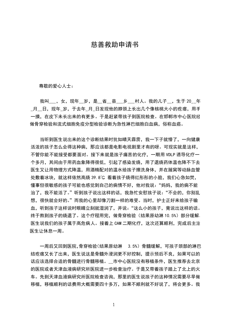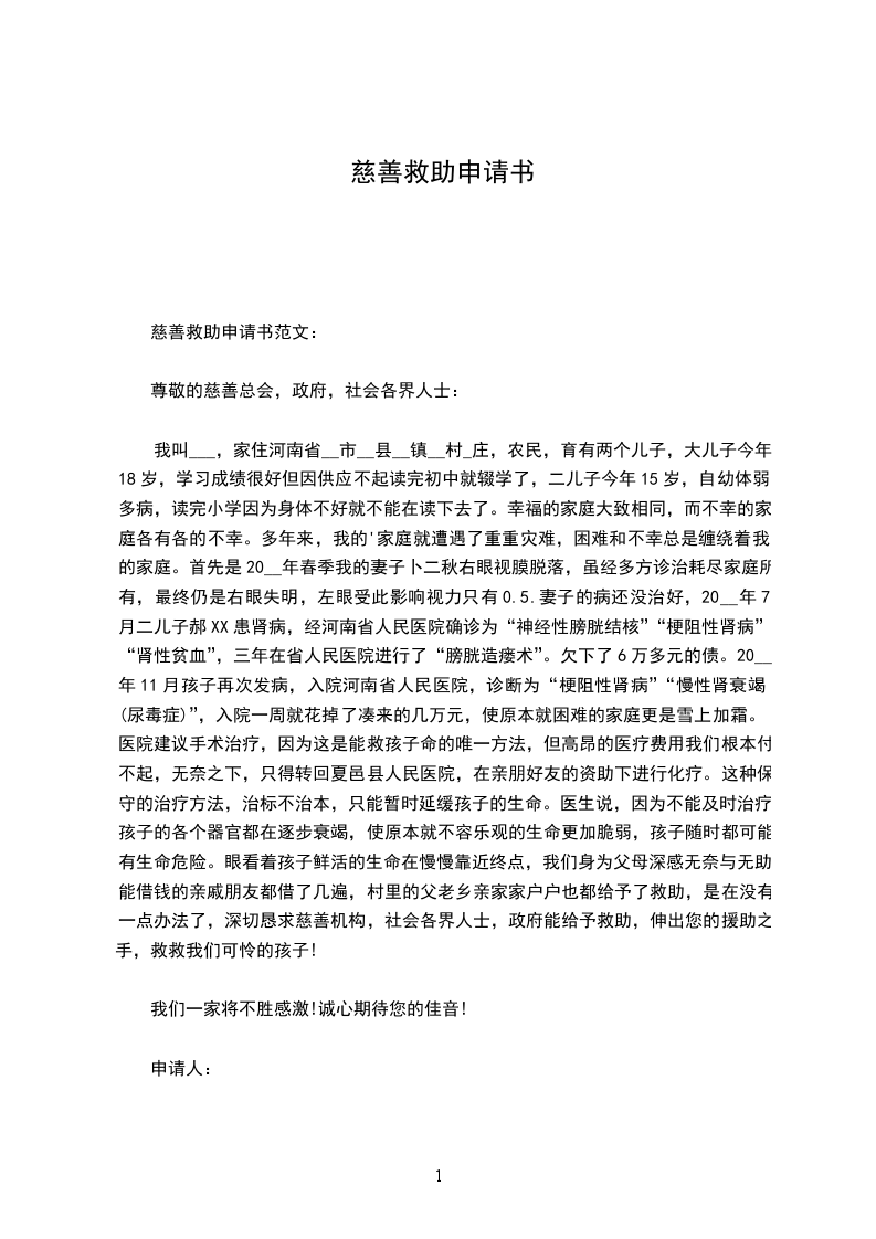 我叫___,家住河南省__市__县__镇__村_庄,农民,育有两个儿子,大儿子今年18岁,学习成绩很好但因供应不起读完初中就辍学了,二儿子今年15岁,自幼体弱多病,读完小学因为身体不好就不能在读下去了。幸福的家庭大致相同,而不幸的家庭各有各的不幸。多年来,我的'家庭就遭遇了重重灾难,困难和不幸总是缠绕着我的家庭。首先是20__年春季我的妻子卜二秋右眼视膜脱落,虽经多方诊治耗尽家庭所有,最终仍是右眼失明,左眼受此影响视力只有0.5.妻子的病还没治好,20__年7月二儿子郝XX患肾病,经河南省人民医院确诊为“神经性膀胱结核”“梗阻性肾病”“肾性贫血”,三年在省人民医院进行了“膀胱造瘘术”。欠下了6万多元的债。20__年11月孩子再次发病,入院河南省人民医院,诊断为“梗阻性肾病”“慢性肾衰竭(尿毒症)”,入院一周就花掉了凑来的几万元,使原本就困难的家庭更是雪上加霜。医院建议手术治疗,因为这是能救孩子命的唯一方法,但高昂的医疗费用我们根本付不起,无奈之下,只得转回夏邑县人民医院,在亲朋好友的资助下进行化疗。这种保守的治疗方法,治标不治本,只能暂时延缓孩子的生命。医生说,因为不能及时治疗,孩子的各个器官都在逐步衰竭,使原本就不容乐观的生命更加脆弱,孩子随时都可能有生命危险。眼看着孩子鲜活的生命在慢慢靠近终点,我们身为父母深感无奈与无助。能借钱的亲戚朋友都借了几遍,村里的父老乡亲家家户户也都给予了救助,是在没有一点办法了,深切恳求慈善机构,社会各界人士,政府能给予救助,伸出您的援助之手,救救我们可怜的孩子!