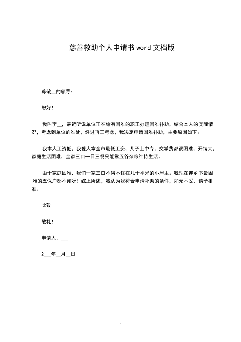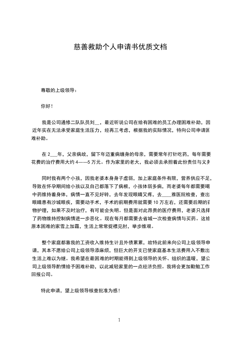 慈善救助申请书范文: