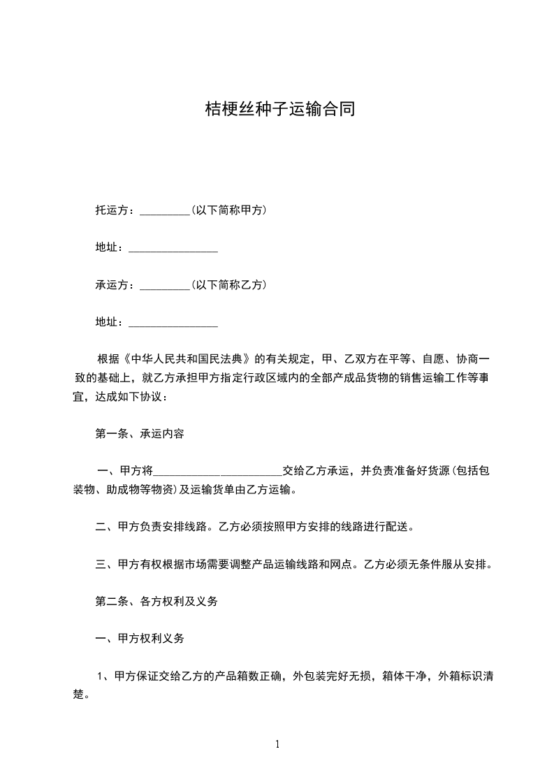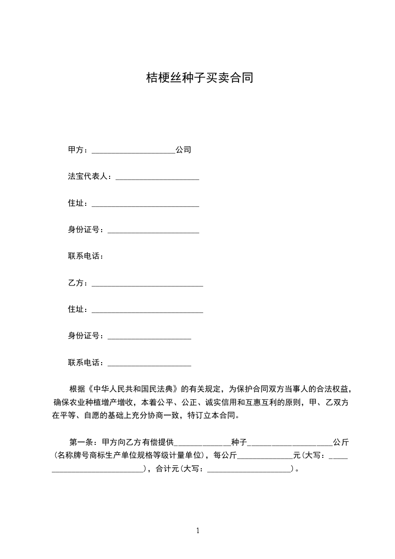 第一条:甲方向乙方有偿提供______________种子_____________________公斤(名称牌号商标生产单位规格等级计量单位),每公斤______________元(大写:____________________________),合计元(大写:_____________________)。