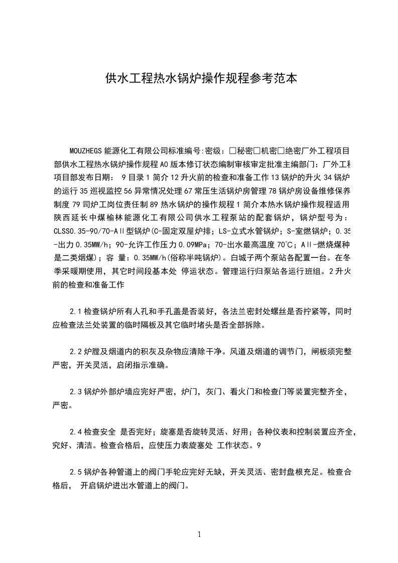 MOUZHEGS能源化工有限公司标准编号:密级:□秘密□机密□绝密厂外工程项目部供水工程热水锅炉操作规程A0版本修订状态编制审核审定批准主编部门:厂外工程项目部发布日期: 9目录1简介12升火前的检查和准备工作13锅炉的升火34锅炉的运行35巡视监控56异常情况处理67常压生活锅炉房管理78锅炉房设备维修保养制度79司炉工岗位责任制89热水锅炉的操作规程1简介本热水锅炉操作规程适用 陕西延长中煤榆林能源化工有限公司供水工程泵站的配套锅炉,锅炉型号为:CLSS0.35-90/70-AⅡ型锅炉(C-固定双屋炉排;LS-立式水管锅炉;S-室燃锅炉;0.35-出力0.35MW/h;90-允许工作压力0.09MPa;70-出水最高温度70℃;AⅡ-燃烧煤种是二类烟煤);容 量:0.35MW/h(俗称半吨锅炉)。白城子两个泵站各配置一台。在冬季采暖期使用,其它时间段基本处 停运状态。管理运行归泵站各运行班组。2升火前的检查和准备工作