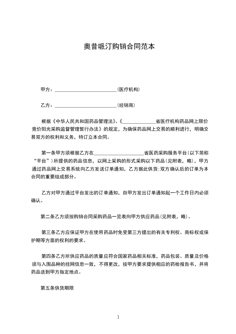 第一条甲方须根据乙方在_____________________省医药采购服务平台(以下简称“平台”)所提供的药品信息,以网上采购的形式采购以下药品(见附表,略),甲方通过药品网上交易系统向乙方发送订单通知,乙方据此供货;双方确认后的订单为本合同的重要组成部分。