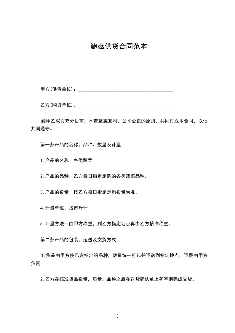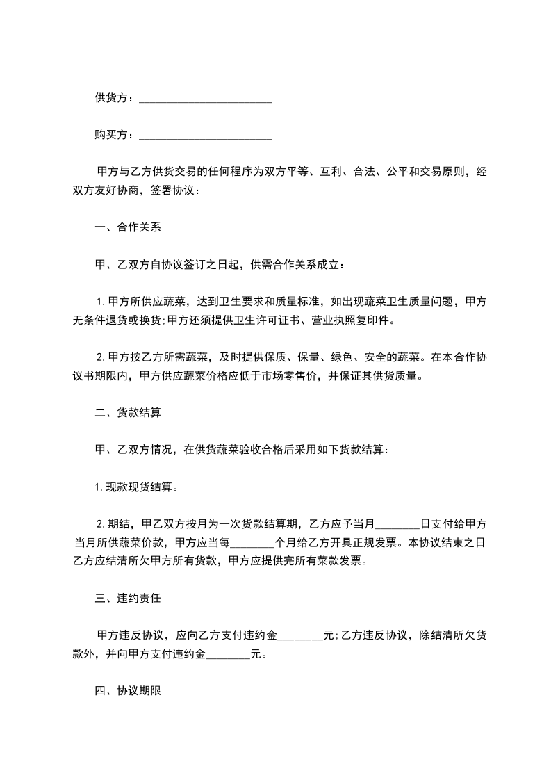 1、乙方为甲方提供蔬菜类产品约______种左右,供货价格乙方承诺在成本价格上加价______元/公斤—______元/公斤,必须保证为市场最低供货价格。