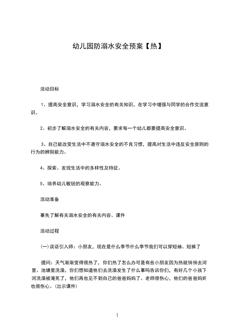 1、提高安全意识,学习溺水安全的有关知识。