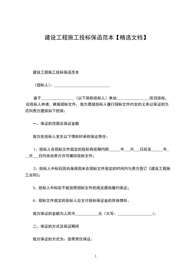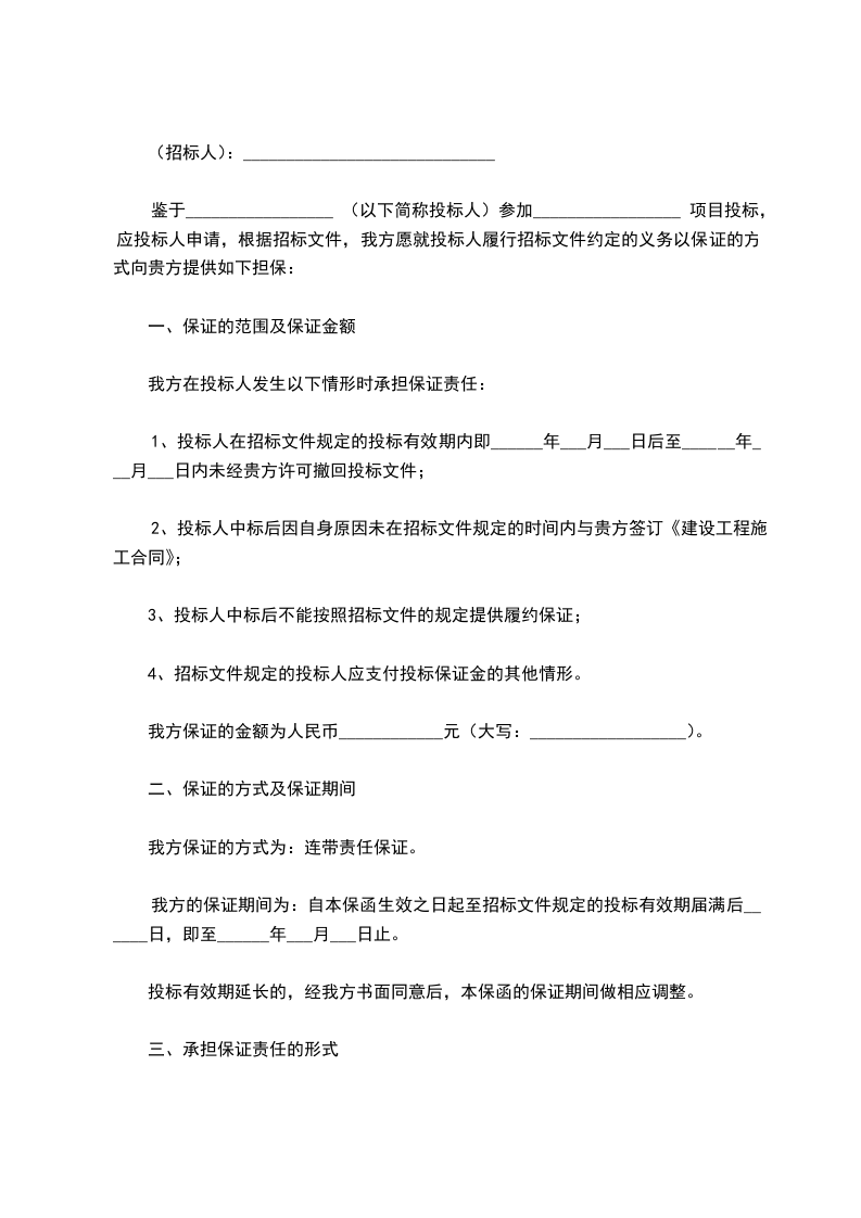 鉴于_________________ (以下简称投标人)参加_________________ 项目投标,应投标人申请,根据招标文件,我方愿就投标人履行招标文件约定的义务以保证的方式向贵方提供如下担保: