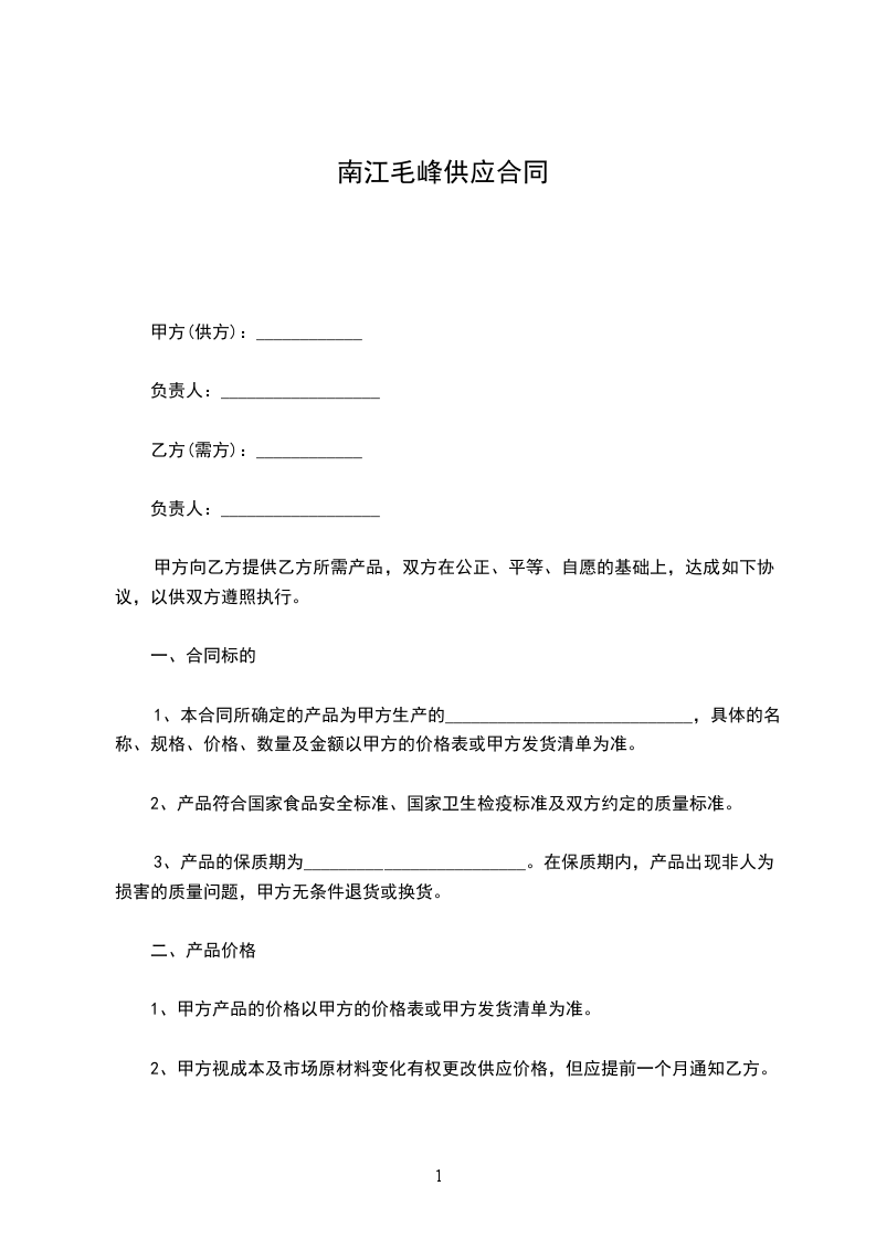 2、甲方视成本及市场原材料变化有权更改供应价格,但应提前一个月通知乙方。