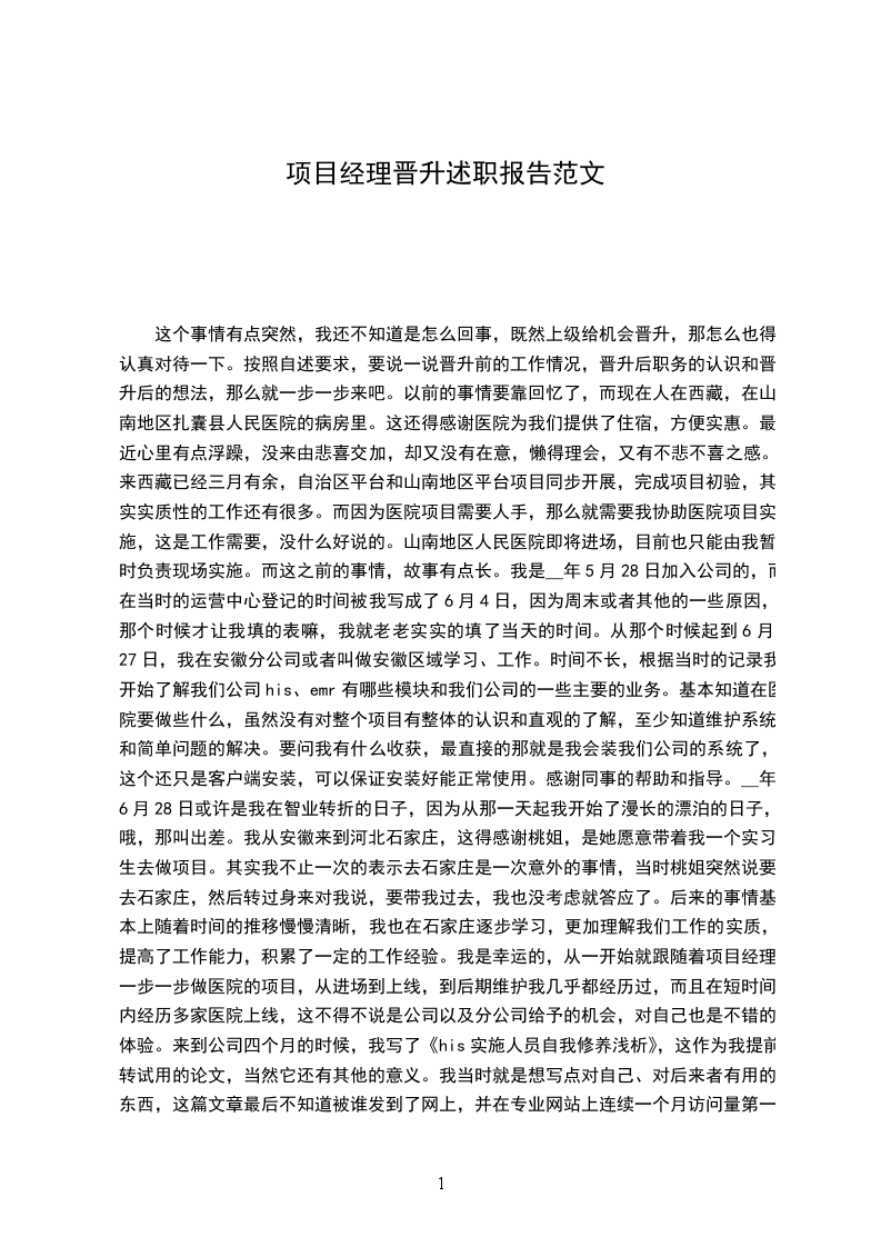这个事情有点突然,我还不知道是怎么回事,既然上级给机会晋升,那怎么也得认真对待一下。按照自述要求,要说一说晋升前的工作情况,晋升后职务的认识和晋升后的想法,那么就一步一步来吧。以前的事情要靠回忆了,而现在人在西藏,在山南地区扎囊县人民医院的病房里。这还得感谢医院为我们提供了住宿,方便实惠。最近心里有点浮躁,没来由悲喜交加,却又没有在意,懒得理会,又有不悲不喜之感。来西藏已经三月有余,自治区平台和山南地区平台项目同步开展,完成项目初验,其实实质性的工作还有很多。而因为医院项目需要人手,那么就需要我协助医院项目实施,这是工作需要,没什么好说的。山南地区人民医院即将进场,目前也只能由我暂时负责现场实施。而这之前的事情,故事有点长。我是__年5月28日加入公司的,而在当时的运营中心登记的时间被我写成了6月4日,因为周末或者其他的一些原因,那个时候才让我填的表嘛,我就老老实实的填了当天的时间。从那个时候起到6月27日,我在安徽分公司或者叫做安徽区域学习、工作。时间不长,根据当时的记录我开始了解我们公司his、emr有哪些模块和我们公司的一些主要的业务。基本知道在医院要做些什么,虽然没有对整个项目有整体的认识和直观的了解,至少知道维护系统和简单问题的解决。要问我有什么收获,最直接的那就是我会装我们公司的系统了,这个还只是客户端安装,可以保证安装好能正常使用。感谢同事的帮助和指导。__年6月28日或许是我在智业转折的日子,因为从那一天起我开始了漫长的漂泊的日子,哦,那叫出差。我从安徽来到河北石家庄,这得感谢桃姐,是她愿意带着我一个实习生去做项目。其实我不止一次的表示去石家庄是一次意外的事情,当时桃姐突然说要去石家庄,然后转过身来对我说,要带我过去,我也没考虑就答应了。后来的事情基本上随着时间的推移慢慢清晰,我也在石家庄逐步学习,更加理解我们工作的实质,提高了工作能力,积累了一定的工作经验。我是幸运的,从一开始就跟随着项目经理一步一步做医院的项目,从进场到上线,到后期维护我几乎都经历过,而且在短时间内经历多家医院上线,这不得不说是公司以及分公司给予的机会,对自己也是不错的体验。来到公司四个月的时候,我写了《his实施人员自我修养浅析》,这作为我提前转试用的论文,当然它还有其他的意义。我当时就是想写点对自己、对后来者有用的东西,这篇文章最后不知道被谁发到了网上,并在专业网站上连续一个月访问量第一,这也侧面表现出此文还是具有普遍借鉴意义的。这个不重要,重要的是我提前转试用了,这让我可以更好的进行以后的工作。随后我参与了石家庄市三院、石家庄市第一医院的上线支持工作,更加直观的了解医院项目实施,我明白项目准备和项目上线完全是两码事,上线就是一场没有硝烟的战争。这些项目上线经验为我以后写出《his实施是一场没有硝烟的战争》提供了素材,这同样是一篇在网上引起巨大共鸣的文章。我是__年6月份直接转正的,试用的时间有点长,他们说这是制度。之后因为一些特殊的原因我直接就成了石家庄市三院的项目经理了,感谢分公司领导的信任,医院的支持与配合。在三院期间完成了自助系统的实施、移动医护的实施,这让我又赚了一把经验,毕竟并不是每个人都有机会实施移动医护的嘛。其实那段时间很忙,也是我第二次成长的时候,第一次做项目负责人,要承担责任。根据当时的记录,那个时候还是有很多事情需要处理的,因为要上一些新东西,增加一些新功能,有国家的民生考察团的来医院参观,总之一堆事情吧。当时也算是临危受命吧,也就是从那个时候开始,自己完成了从项目组普通成员、项目组骨干到项目负责人的转变,这次体验对自己以后的工作很有意义。说实话,刚开始的时候我还不能适应自己面对一切,毕竟之前不是我负主要责任。在最初的几天里明显感觉得到工作很棘手,不过我想这也是我学习的机会,我重新审视了自己,在困难的时候锻炼自己。我那时的心情,现在想想还是能够理解自己的。我在当时的备忘录中写道:老实说,刚接手项目的一周,我的确不适应,该做的都做了,还是感觉到无从下手,因为那些事情都是自己撞上来的,并不是我安排好的。对 整个项目的把握和掌控我还欠缺火候。这是不自信,也是自信,因为我清楚的知道自己,坦诚自我。做项目负责人和普通的实施人员或者是项目骨干有很大很大的差别,很多事情都要你去考虑,你负主要责任。对 一些事情的处理,我有自己的看法和作法,这有时候也并不能让他人满意,我知道我该学的还有很多。一周之后,我渐渐上手了,我找回感觉,我知道状态是暂时的,能力是永恒的,我还是那个敢 做自己的自己!有时候也许我不能让老板和客户满意,那又怎么样呢?他们总是对的吗?都不能惯着,我可以走,但是我不可以错,没有什么大不了,我重新找回自己,就要树立这样的信心,大不了不干!我不是激进派,可我有我做事的原则和作风。有人说我作风硬朗,和我踢球一样,可以拼死,也不服软。这点以前我的老师和朋友都说,以后要改改,不然会吃亏的。我不想那么累,不想什么事情都委曲求全。我尊重每一个人,我也希望他们能尊重我。在一段时间之后,我完成了对项目的控制,我告诉自己和所有人是我自己在做项目,