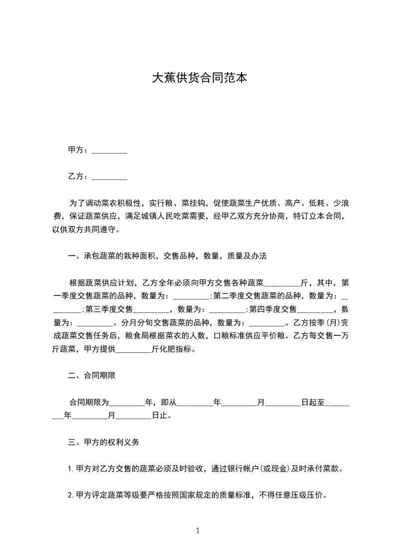 为了调动菜农积极性,实行粮、菜挂钩,促使蔬菜生产优质、高产、低耗、少浪费,保证蔬菜供应,满足城镇人民吃菜需要,经甲乙双方充分协商,特订立本合同,以供双方共同遵守。