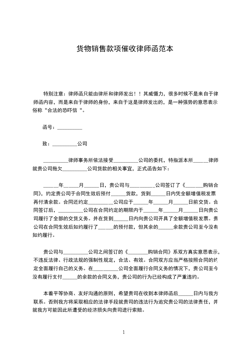 __________律师事务所依法接受__________公司的委托,特指派本所______律师就贵公司拖欠__________公司货款的相关事宜,正式函告如下: