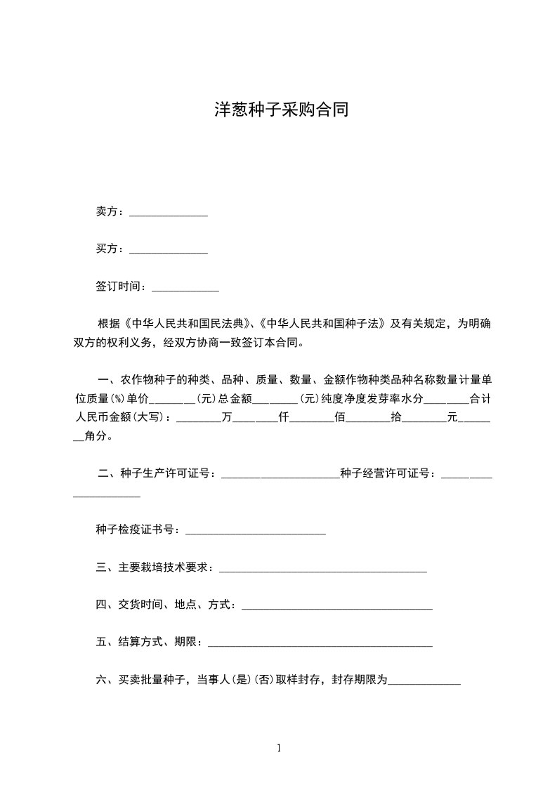 一、农作物种子的种类、品种、质量、数量、金额作物种类品种名称数量计量单位质量(%)单价________(元)总金额________(元)纯度净度发芽率水分________合计人民币金额(大写):________万________仟________佰________拾________元________角分。