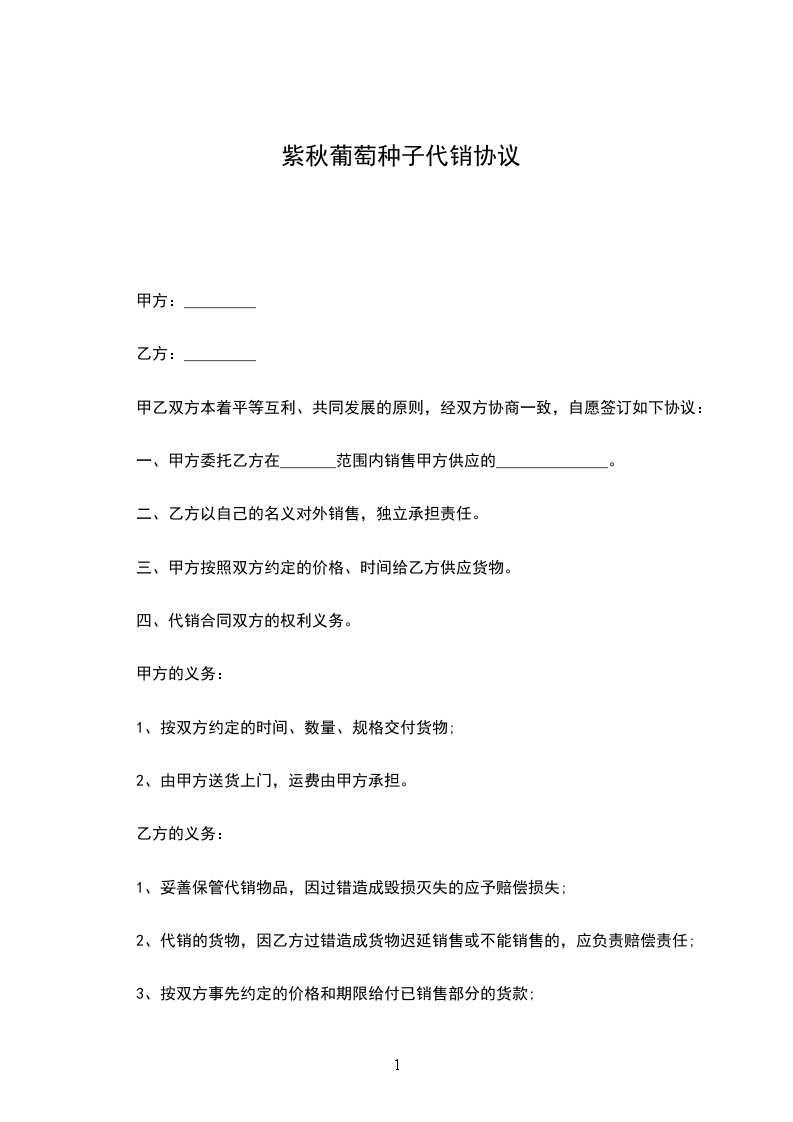 一、乙方自愿代理销售甲方品种,并遵守本合同约定的全部事项和甲方制定的销售政策。