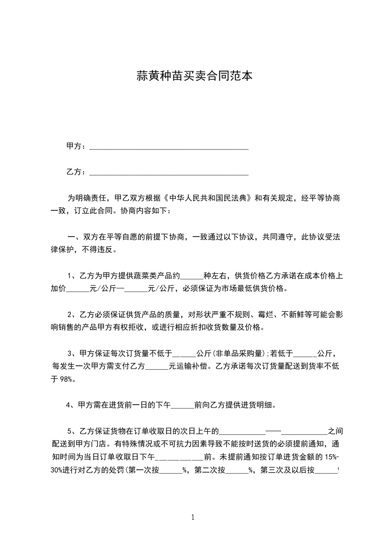 1、乙方为甲方提供蔬菜类产品约______种左右,供货价格乙方承诺在成本价格上加价______元/公斤—______元/公斤,必须保证为市场最低供货价格。