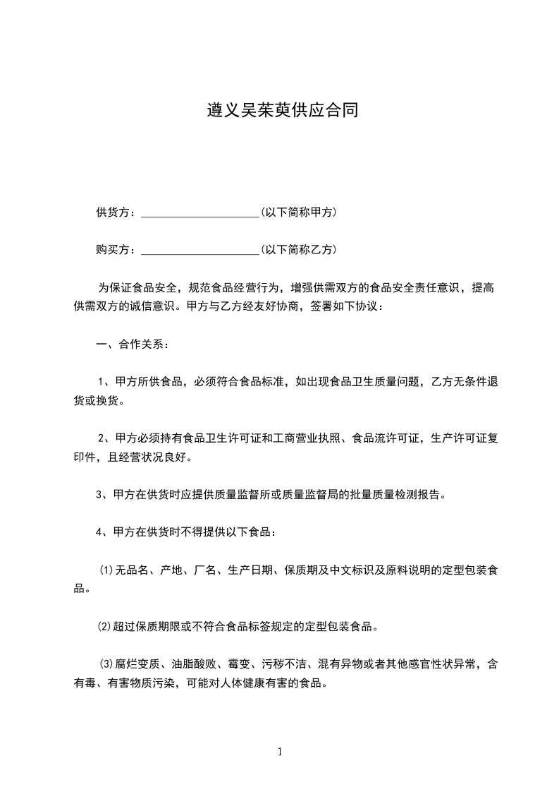 1、甲方如因食用乙方所提供食品导致发生食物中毒,经有关单位鉴定原因属实后,乙方除承担全部医药费、赔偿费用,同时承担全部法律责任。