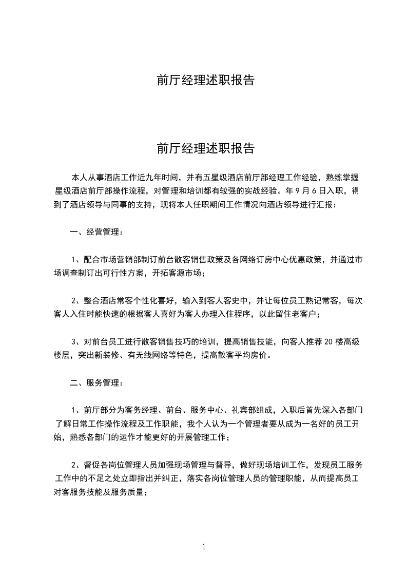 本人从事酒店工作近九年时间,并有五星级酒店前厅部经理工作经验,熟练掌握星级酒店前厅部操作流程,对管理和培训都有较强的实战经验。年9月6日入职,得到了酒店领导与同事的支持,现将本人任职期间工作情况向酒店领导进行汇报: