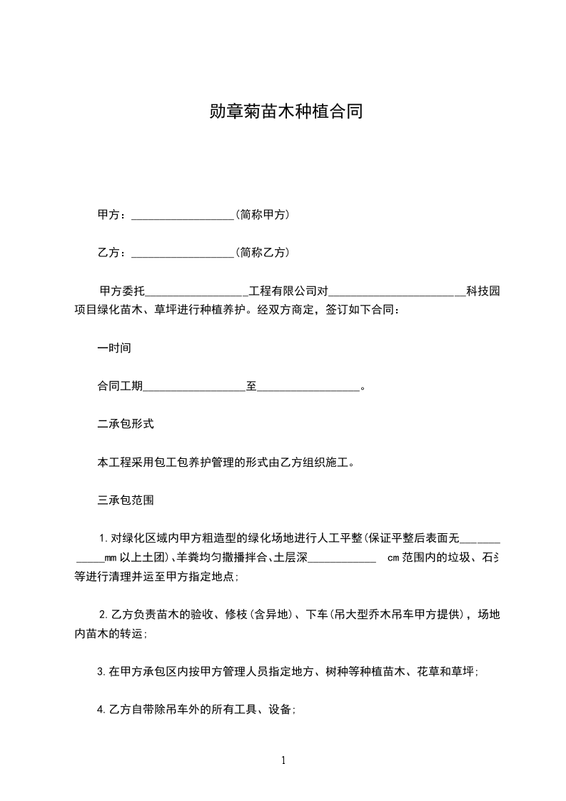 甲方将所承接的___________________________________工程的绿化种植工作承包给乙方施工,依照《中华人民共和国民法典》及其相关法律,为明确双方职责,确保如期保质完成本工程。甲、乙双方在自愿、平等、诚信的基础上,就的相关事项协商一致,并签订如下协议,以期共同遵守。