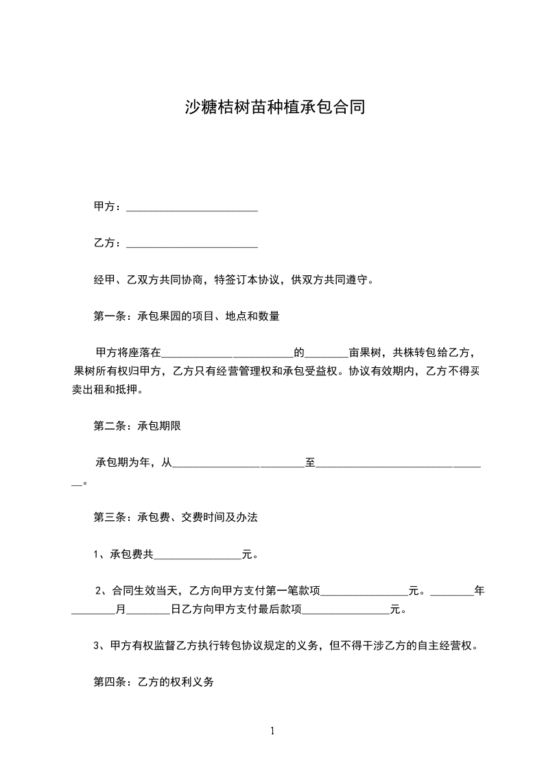 3、甲方若在________年______月______日前不能向乙方提供合同内的土地承包面积,甲方向乙方赔偿所有苗木费和运输费(每株苗木费和运输费按______元计)。