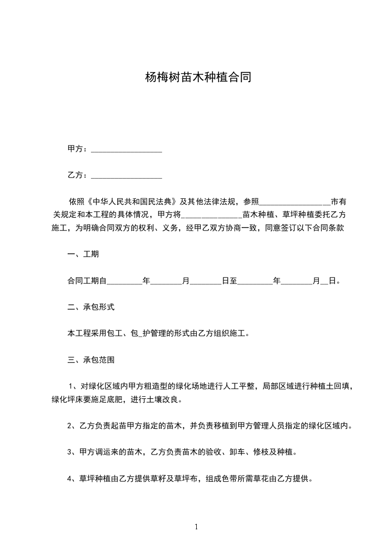 依照《中华人民共和国民法典》及其他法律法规,参照__________________市有关规定和本工程的具体情况,甲方将_______________苗木种植、草坪种植委托乙方施工,为明确合同双方的权利、义务,经甲乙双方协商一致,同意签订以下合同条款。