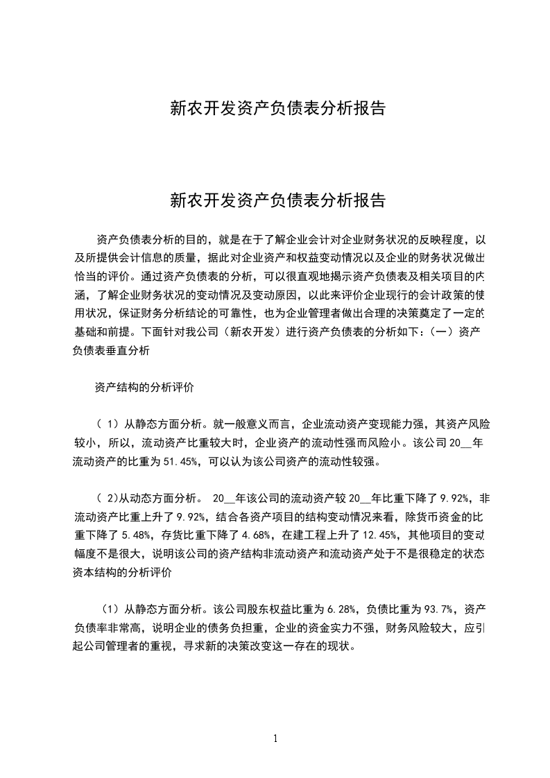资产负债表分析的目的,就是在于了解企业会计对企业财务状况的反映程度,以及所提供会计信息的质量,据此对企业资产和权益变动情况以及企业的财务状况做出恰当的评价。通过资产负债表的分析,可以很直观地揭示资产负债表及相关项目的内涵,了解企业财务状况的变动情况及变动原因,以此来评价企业现行的会计政策的使用状况,保证财务分析结论的可靠性,也为企业管理者做出合理的决策奠定了一定的基础和前提。下面针对我公司(新农开发)进行资产负债表的分析如下:(一)资产负债表垂直分析