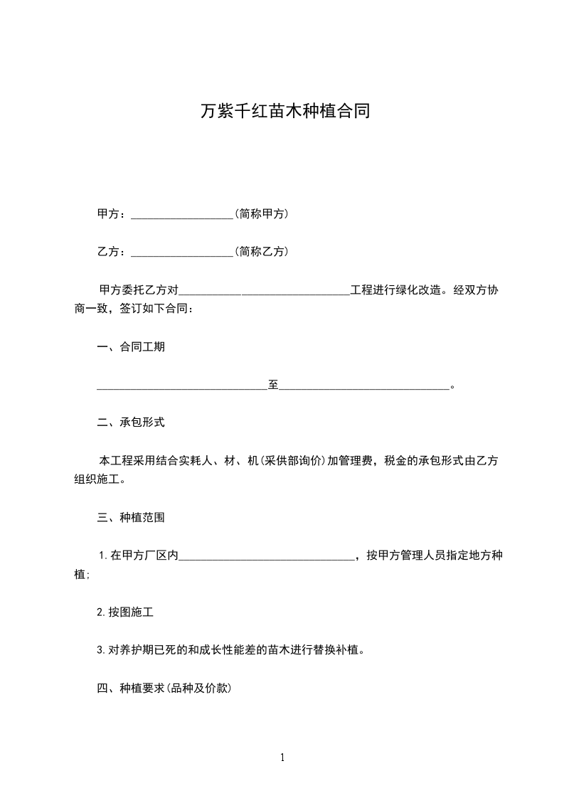 依照《中华人民共和国民法典》及其他法律法规,参照__________________市有关规定和本工程的具体情况,甲方将_______________苗木种植、草坪种植委托乙方施工,为明确合同双方的权利、义务,经甲乙双方协商一致,同意签订以下合同条款。