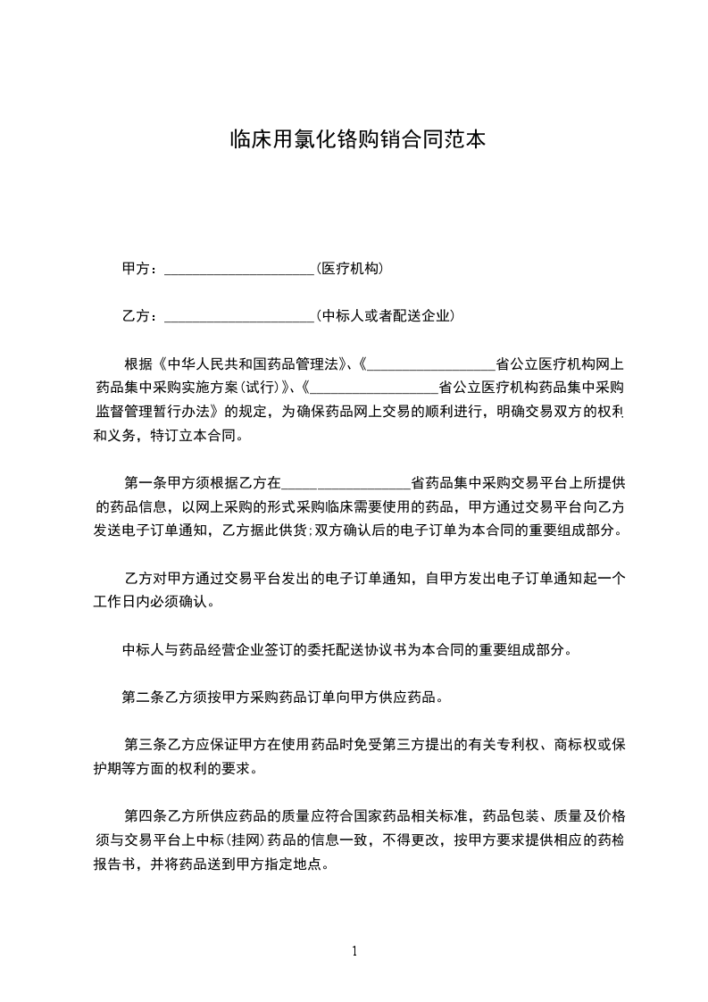 第一条甲方须根据乙方在__________________省药品集中采购交易平台上所提供的药品信息,以网上采购的形式采购临床需要使用的药品,甲方通过交易平台向乙方发送电子订单通知,乙方据此供货;双方确认后的电子订单为本合同的重要组成部分。