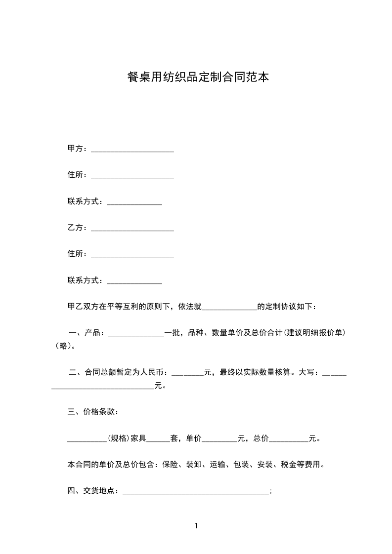 餐桌用纺织品供货合同