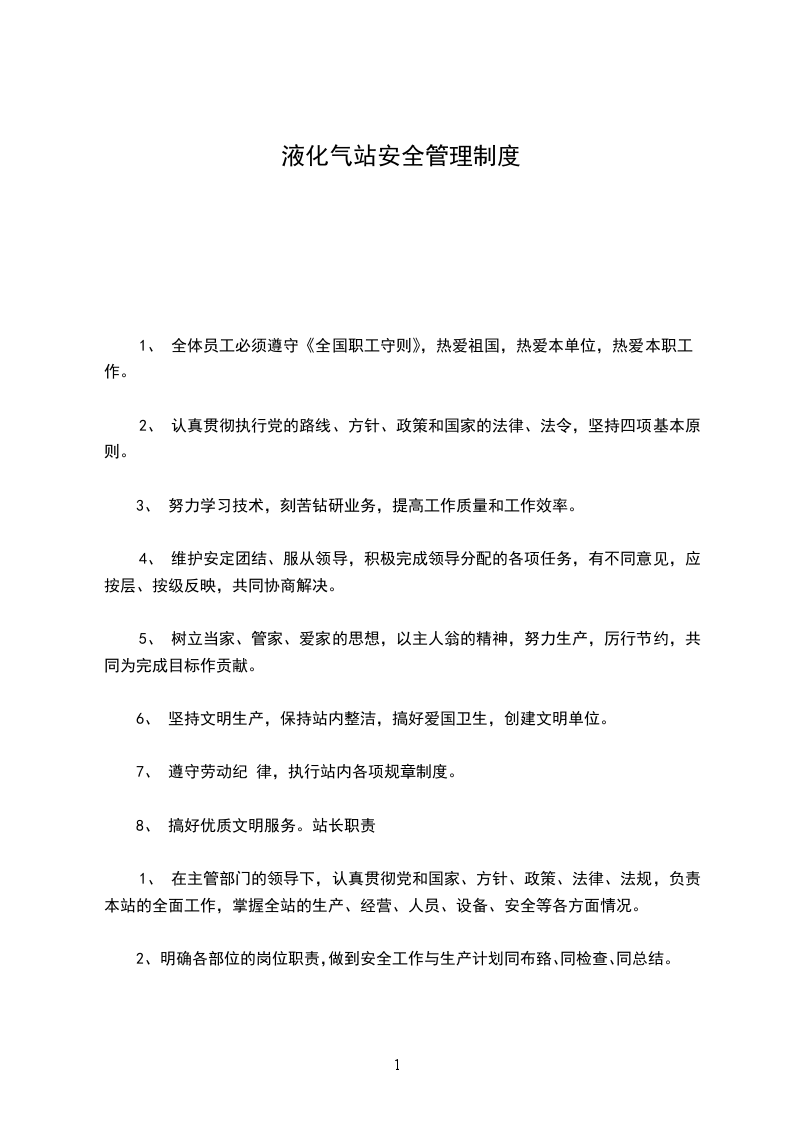 8、 按站安排每日有2人值班,负责夜间巡逻,并负责值班房地面卫生。交接班制度l、严格执行交接班制度,做到四交接(磅秤、钢瓶、任务及工作),并 认真填好记录。
