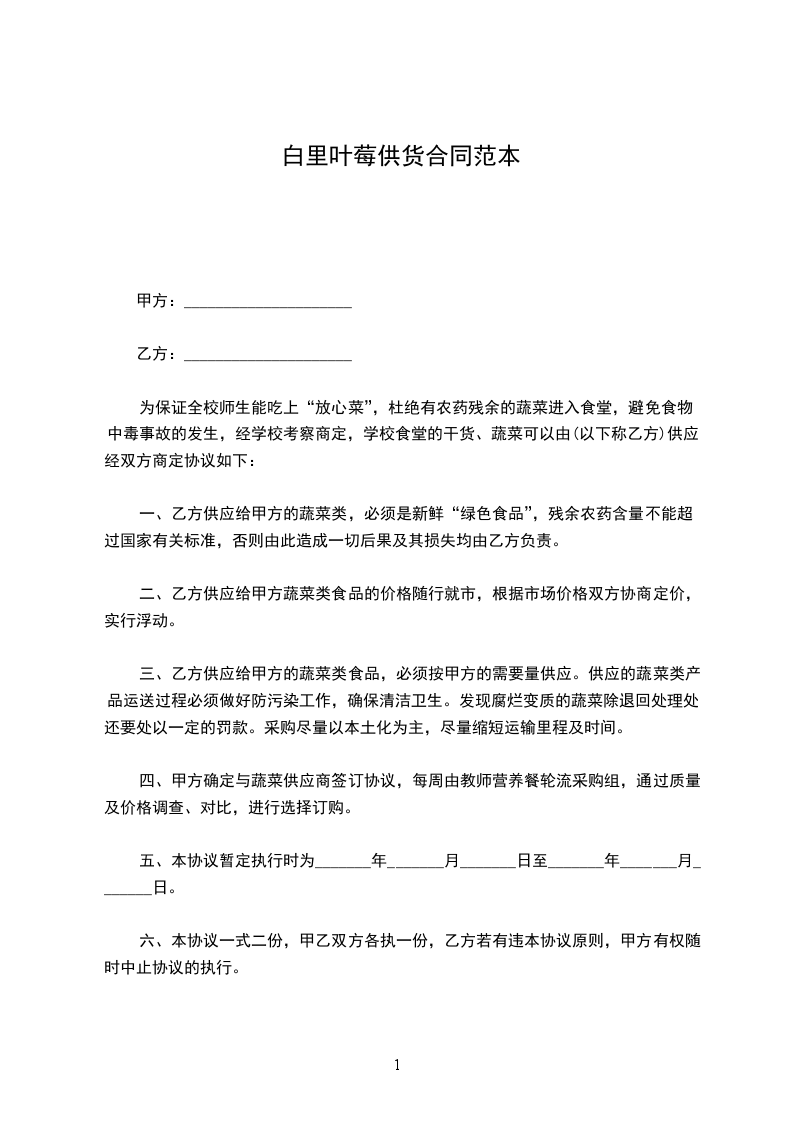 一、乙方供应给甲方的蔬菜类,必须是新鲜“绿色食品”,残余农药含量不能超过国家有关标准,否则由此造成一切后果及其损失均由乙方负责。