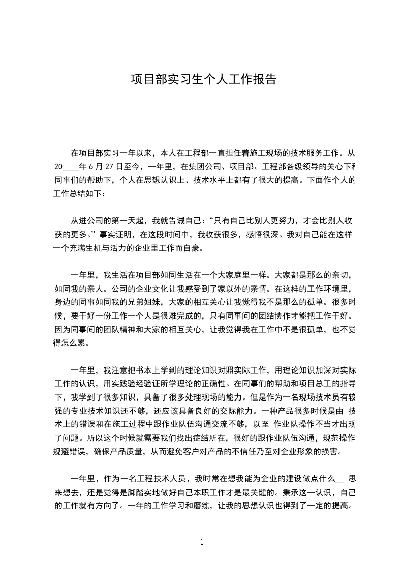 在项目部实习一年以来,本人在工程部一直担任着施工现场的技术服务工作。从20____年6月27日至今,一年里,在集团公司、项目部、工程部各级领导的关心下和同事们的帮助下,个人在思想认识上、技术水平上都有了很大的提高。下面作个人的工作总结如下: